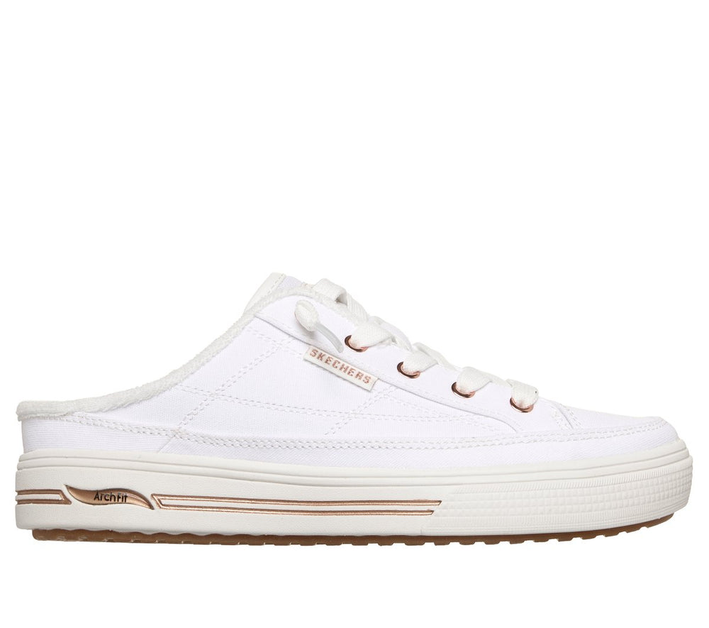Walk in supportive comfort with a stylish classic wearing Skechers Street™ Arch Fit® Arcade - Find Ya There. This backless easy-on design has been granted the APMA Seal of Acceptance and features a canvas upper with contrast stitching, decorative laces, a removable Arch Fit® insole, and a lightweight cushioned midsole.